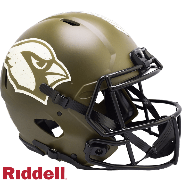 The Salute to Service helmets are inspired by those used by the military for decades, and are meant to honor the memory and selfless sacrifices of service members past and present. Each helmet features a dark satin olive green color shell with black internal parts, decals that are a stressed off-white single color depiction of team logos, a chevron top stripe pattern, a stencil city name on front bumper, stencil “Salute to Service” back bumper, US Flag and official Sature to Service Ribbon. Made by Riddell.