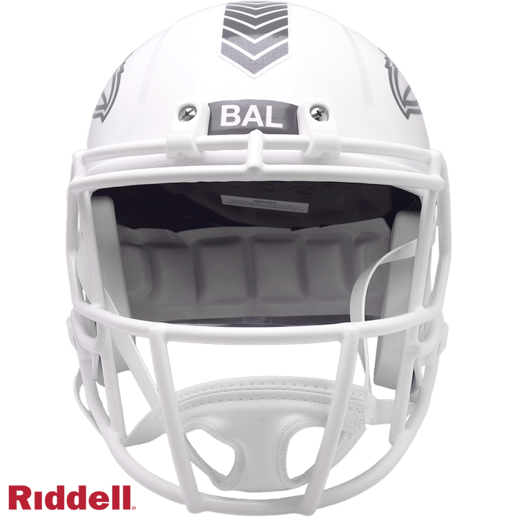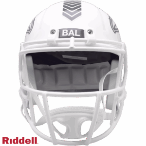 The Salute to Service helmets are inspired by those used by the military for decades, and are meant to honor the memory and selfless sacrifices of service members past and present. Each helmet features team logos, a chevron top stripe pattern, a stencil city name on front bumper, stencil Salute to Service back bumper, US Flag and official Sature to Service Ribbon. Made by Riddell.