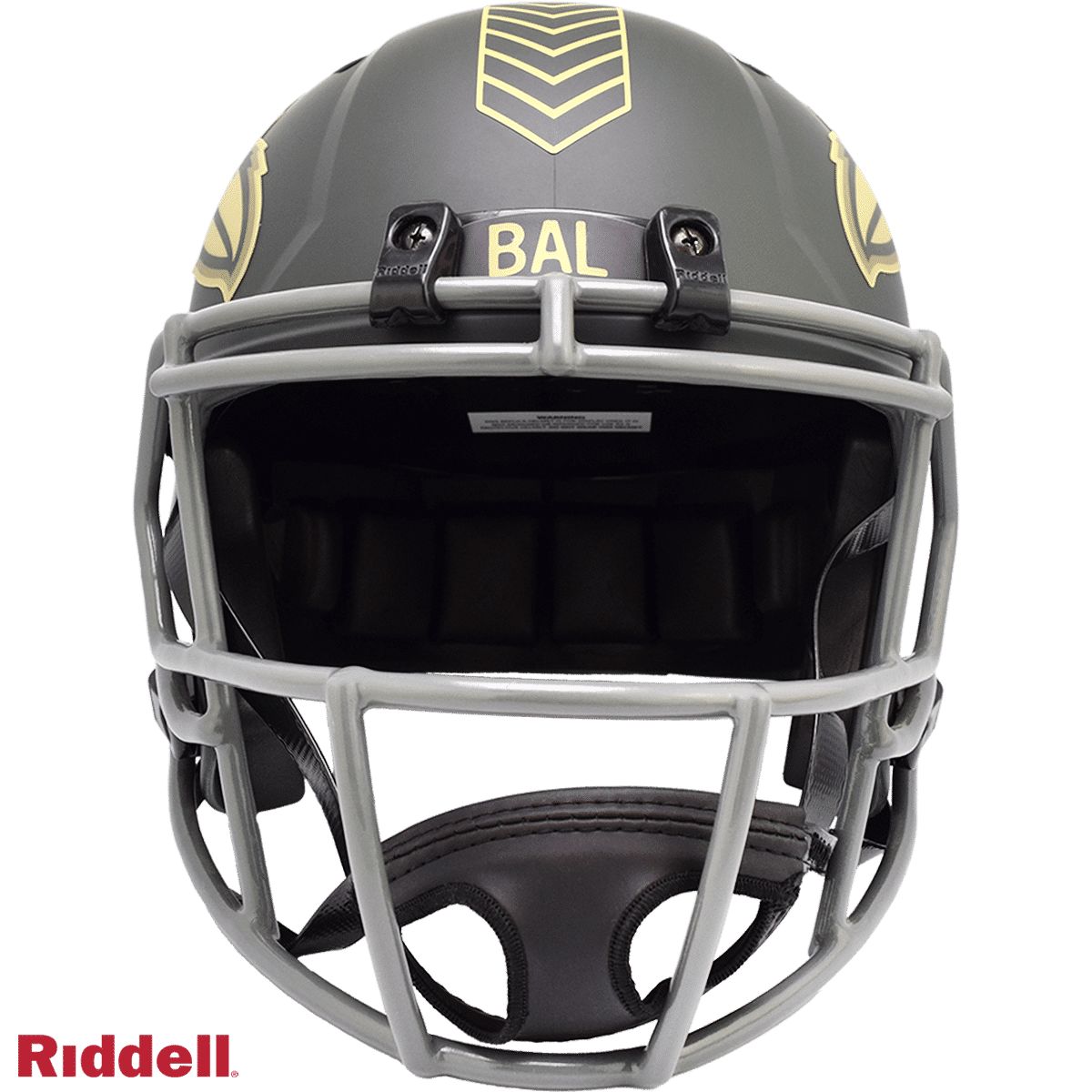 The 2025 NFL Salute to Service helmets are inspired by those used by the military for decades and are meant to honor the memory and selfless sacrifices of service members past and present. Each helmet is painted in a dark green satin finish with black appointments and dark gray face mask. The matte tonal decals match the official 2025 Salute to Service design elements and colorway. A chevron stripe pattern is used on every helmet, along with city name abbreviations on front bumpers, and Salute to Service back bumper decals. The helmet includes the official Salute to Service ribbon and a tonal U.S. flag. Made by Riddell.