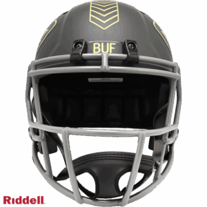 The 2025 NFL Salute to Service helmets are inspired by those used by the military for decades and are meant to honor the memory and selfless sacrifices of service members past and present. Each helmet is painted in a dark green satin finish with black appointments and dark gray face mask. The matte tonal decals match the official 2025 Salute to Service design elements and colorway. A chevron stripe pattern is used on every helmet, along with city name abbreviations on front bumpers, and Salute to Service back bumper decals. The helmet includes the official Salute to Service ribbon and a tonal U.S. flag. Made by Riddell.