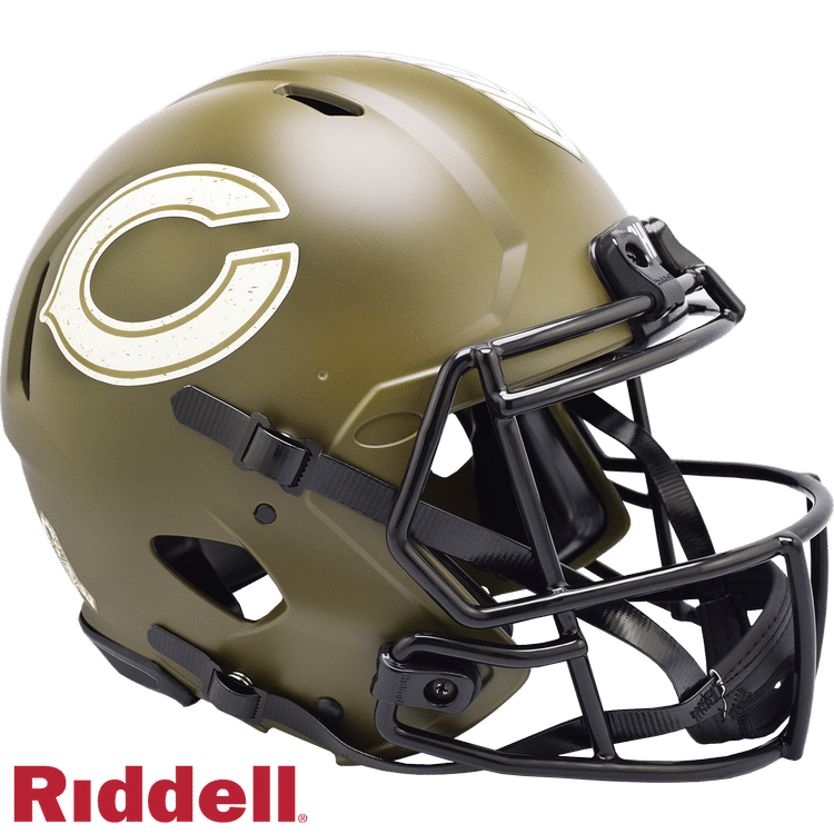 The Salute to Service helmets are inspired by those used by the military for decades, and are meant to honor the memory and selfless sacrifices of service members past and present. Each helmet features a dark satin olive green color shell with black internal parts, decals that are a stressed off-white single color depiction of team logos, a chevron top stripe pattern, a stencil city name on front bumper, stencil “Salute to Service” back bumper, US Flag and official Sature to Service Ribbon. Made by Riddell.