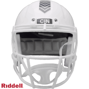 The Salute to Service helmets are inspired by those used by the military for decades, and are meant to honor the memory and selfless sacrifices of service members past and present. Each helmet features team logos, a chevron top stripe pattern, a stencil city name on front bumper, stencil Salute to Service back bumper, US Flag and official Sature to Service Ribbon. Made by Riddell.