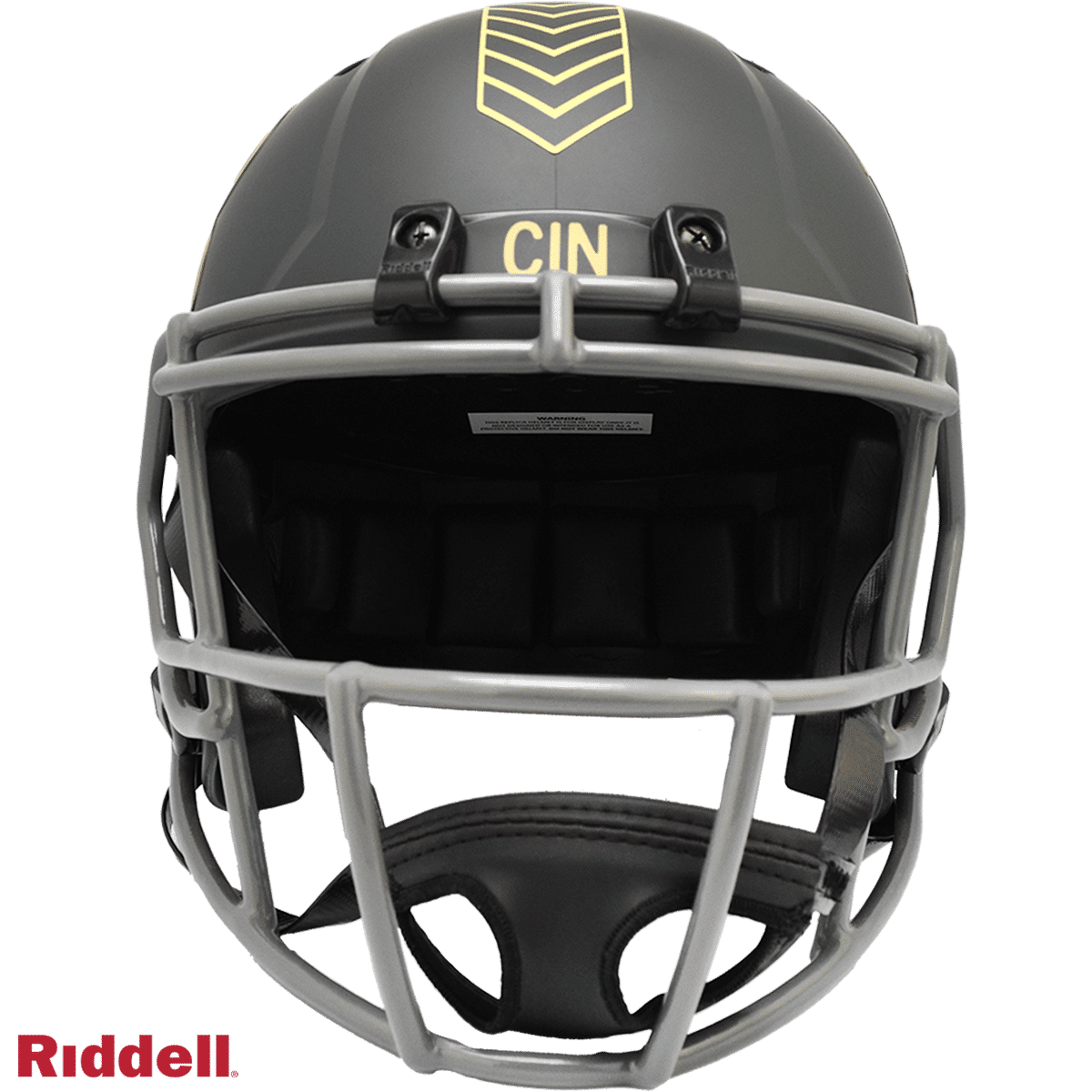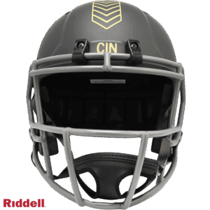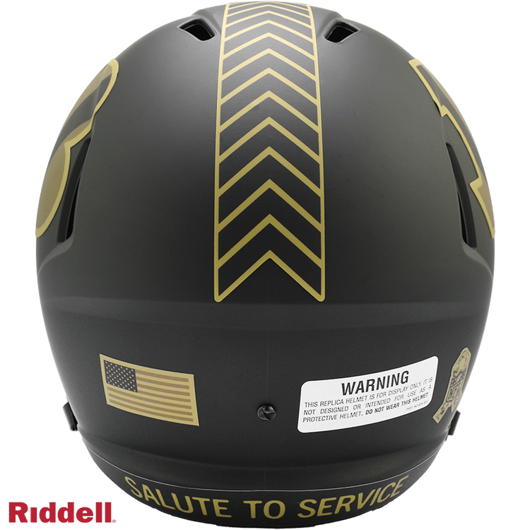 The 2025 NFL Salute to Service helmets are inspired by those used by the military for decades and are meant to honor the memory and selfless sacrifices of service members past and present. Each helmet is painted in a dark green satin finish with black appointments and dark gray face mask. The matte tonal decals match the official 2025 Salute to Service design elements and colorway. A chevron stripe pattern is used on every helmet, along with city name abbreviations on front bumpers, and Salute to Service back bumper decals. The helmet includes the official Salute to Service ribbon and a tonal U.S. flag. Made by Riddell.