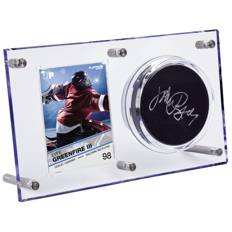 Safely stores and displays 1 puck & 1 standard size trading card up to 120pt thickness.