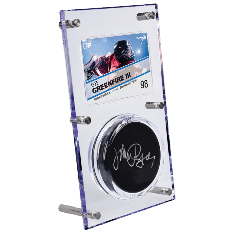 Safely stores and displays 1 puck & 1 standard size trading card up to 35pt thickness.