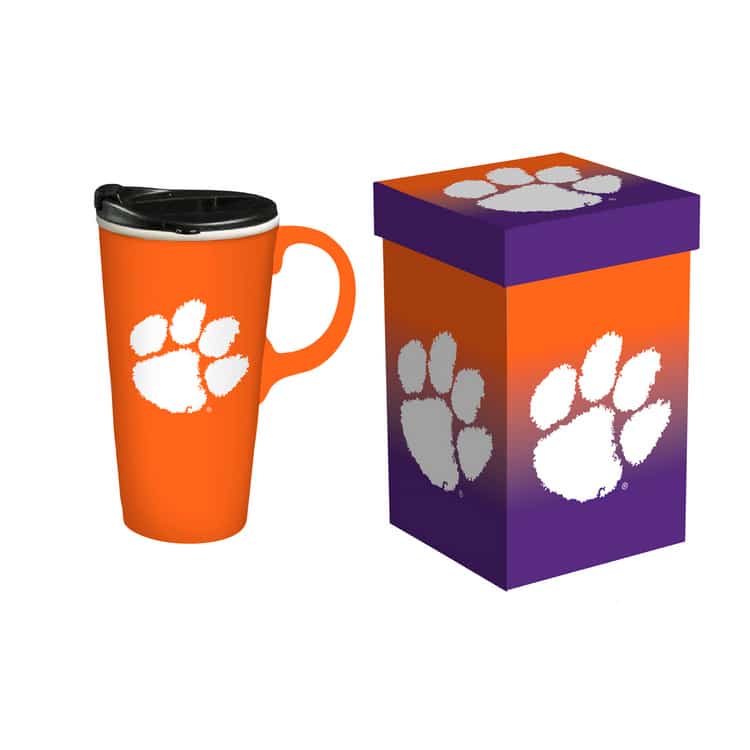 This is a 17oz Travel Cup with handle and leak proof lid. Flip top plastic lid fits cup tightly with three rings of silicone. Coordinating gift box is included, making gift giving easy. Top rack dishwasher safe. Microwave safe. Fits most standard car cup holders. Suitable for hot or cold liquids. Made by Evergreen.