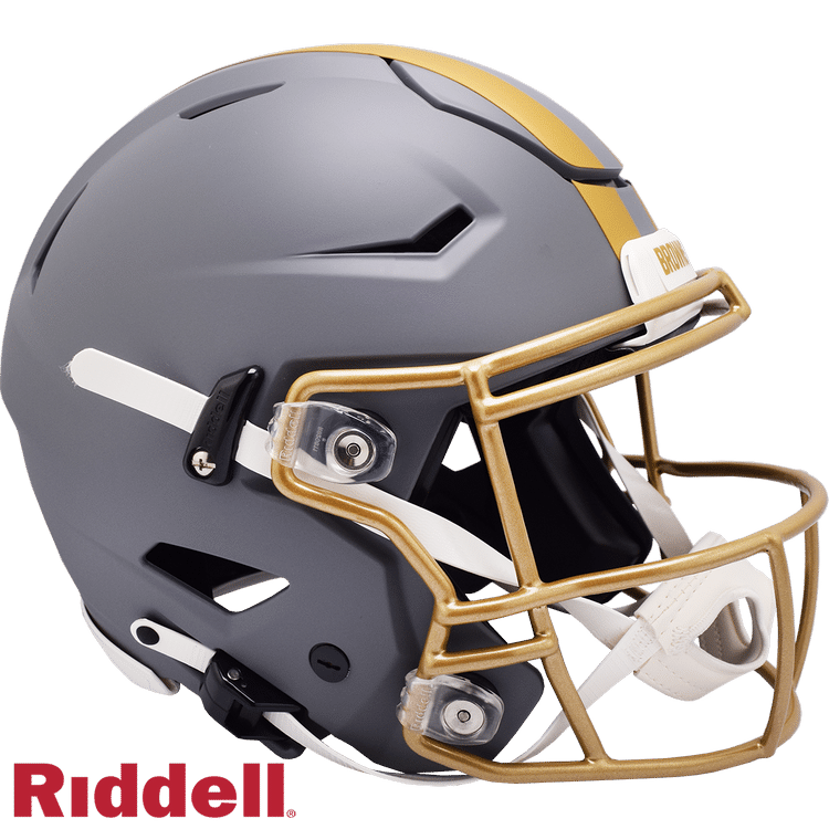 The Slate Collection takes a stylish, distinctive approach to NFL and College helmet design. Each helmet features a flat gray shell, gold or silver facemask and flat-finish gold or silver treatments of the primary helmet decal. Made by Riddell.