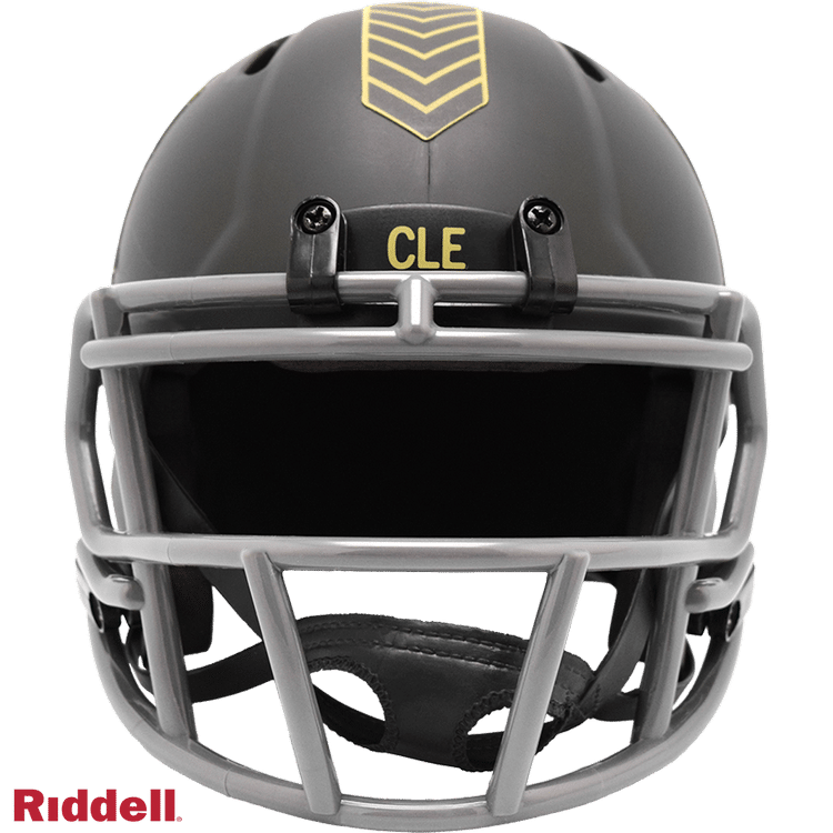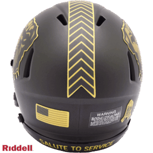 The 2025 NFL Salute to Service helmets are inspired by those used by the military for decades and are meant to honor the memory and selfless sacrifices of service members past and present. Each helmet is painted in a dark green satin finish with black appointments and dark gray face mask. The matte tonal decals match the official 2025 Salute to Service design elements and colorway. A chevron stripe pattern is used on every helmet, along with city name abbreviations on front bumpers, and Salute to Service back bumper decals. The helmet includes the official Salute to Service ribbon and a tonal U.S. flag. Made by Riddell.