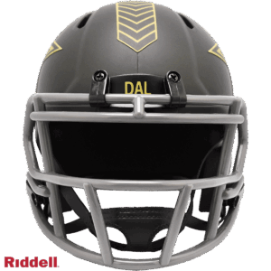 The 2025 NFL Salute to Service helmets are inspired by those used by the military for decades and are meant to honor the memory and selfless sacrifices of service members past and present. Each helmet is painted in a dark green satin finish with black appointments and dark gray face mask. The matte tonal decals match the official 2025 Salute to Service design elements and colorway. A chevron stripe pattern is used on every helmet, along with city name abbreviations on front bumpers, and Salute to Service back bumper decals. The helmet includes the official Salute to Service ribbon and a tonal U.S. flag. Made by Riddell.