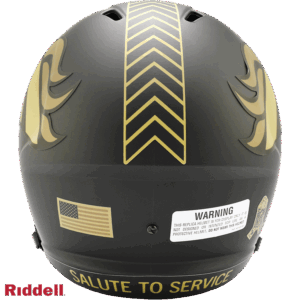 The 2025 NFL Salute to Service helmets are inspired by those used by the military for decades and are meant to honor the memory and selfless sacrifices of service members past and present. Each helmet is painted in a dark green satin finish with black appointments and dark gray face mask. The matte tonal decals match the official 2025 Salute to Service design elements and colorway. A chevron stripe pattern is used on every helmet, along with city name abbreviations on front bumpers, and Salute to Service back bumper decals. The helmet includes the official Salute to Service ribbon and a tonal U.S. flag. Made by Riddell.