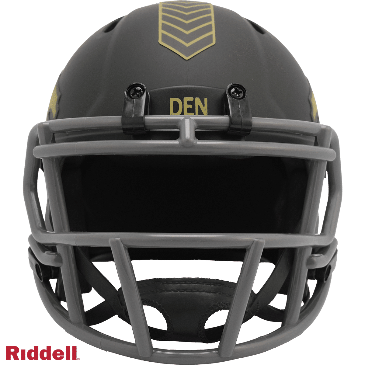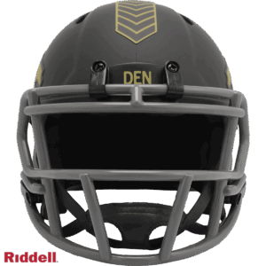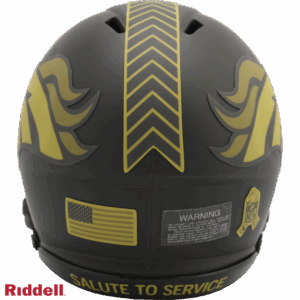 The 2025 NFL Salute to Service helmets are inspired by those used by the military for decades and are meant to honor the memory and selfless sacrifices of service members past and present. Each helmet is painted in a dark green satin finish with black appointments and dark gray face mask. The matte tonal decals match the official 2025 Salute to Service design elements and colorway. A chevron stripe pattern is used on every helmet, along with city name abbreviations on front bumpers, and Salute to Service back bumper decals. The helmet includes the official Salute to Service ribbon and a tonal U.S. flag. Made by Riddell.