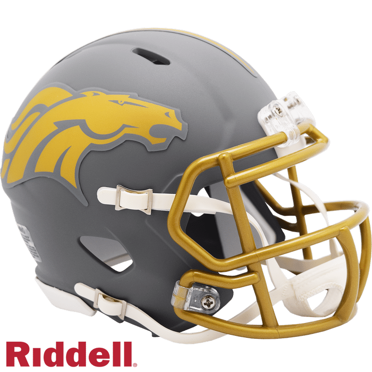 The Slate Collection takes a stylish, distinctive approach to NFL and College helmet design. Each helmet features a flat gray shell, gold or silver facemask and flat-finish gold or silver treatments of the primary helmet decal. Made by Riddell.