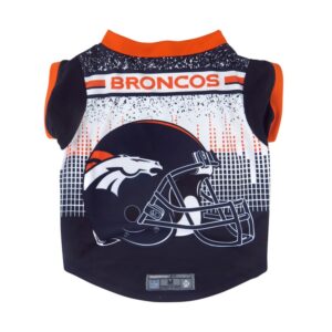 Your pet will go all-pro with the Performance Tee. This moisture-wicking polyester Tee-shirt sports a colorful back with team helmet graphics. The front and sleeves are team color. The stretch fabric makes it easy to pull on or off your pet. Stretch polyester knit. Full color print back, team wordmark on front. Contrast collar and sleeves. Woven jock tag. Made by Little Earth.
