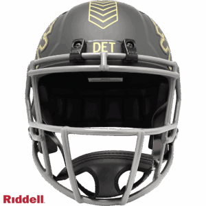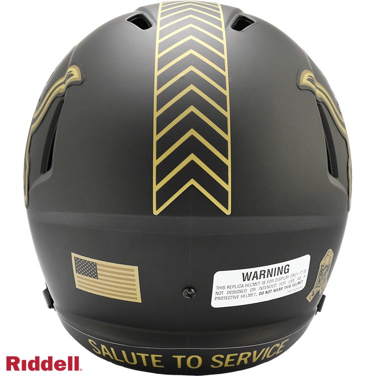 The 2025 NFL Salute to Service helmets are inspired by those used by the military for decades and are meant to honor the memory and selfless sacrifices of service members past and present. Each helmet is painted in a dark green satin finish with black appointments and dark gray face mask. The matte tonal decals match the official 2025 Salute to Service design elements and colorway. A chevron stripe pattern is used on every helmet, along with city name abbreviations on front bumpers, and Salute to Service back bumper decals. The helmet includes the official Salute to Service ribbon and a tonal U.S. flag. Made by Riddell.