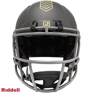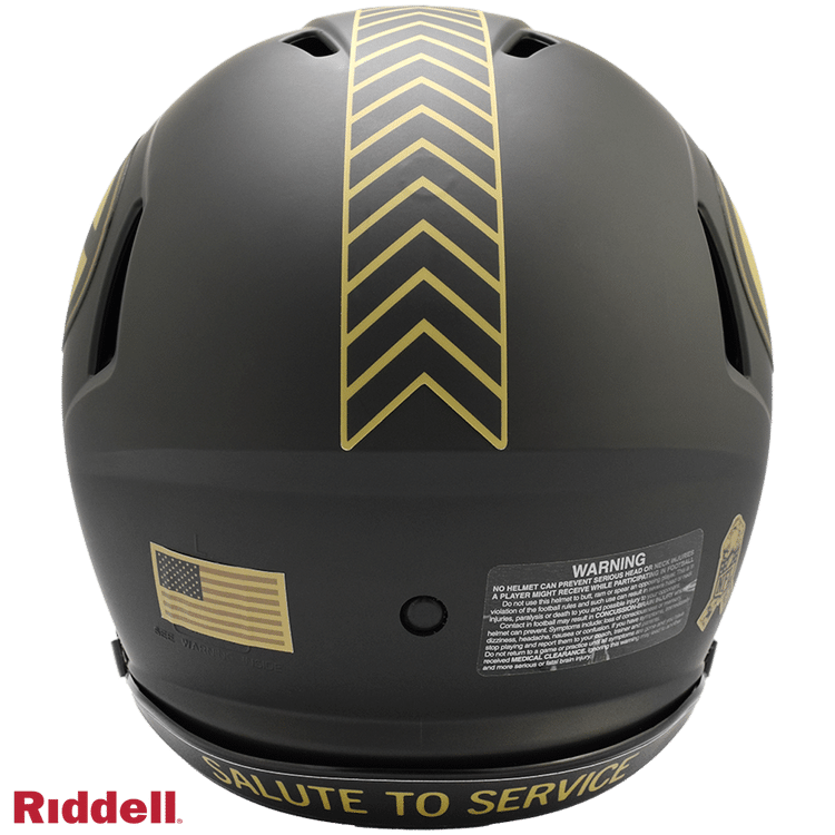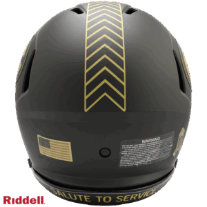 The 2025 NFL Salute to Service helmets are inspired by those used by the military for decades and are meant to honor the memory and selfless sacrifices of service members past and present. Each helmet is painted in a dark green satin finish with black appointments and dark gray face mask. The matte tonal decals match the official 2025 Salute to Service design elements and colorway. A chevron stripe pattern is used on every helmet, along with city name abbreviations on front bumpers, and Salute to Service back bumper decals. The helmet includes the official Salute to Service ribbon and a tonal U.S. flag. Made by Riddell.