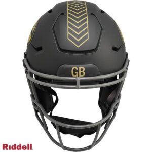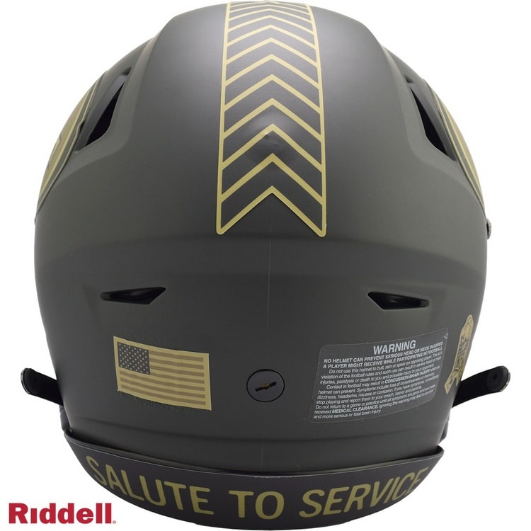 The 2025 NFL Salute to Service helmets are inspired by those used by the military for decades and are meant to honor the memory and selfless sacrifices of service members past and present. Each helmet is painted in a dark green satin finish with black appointments and dark gray face mask. The matte tonal decals match the official 2025 Salute to Service design elements and colorway. A chevron stripe pattern is used on every helmet, along with city name abbreviations on front bumpers, and Salute to Service back bumper decals. The helmet includes the official Salute to Service ribbon and a tonal U.S. flag. Made by Riddell.