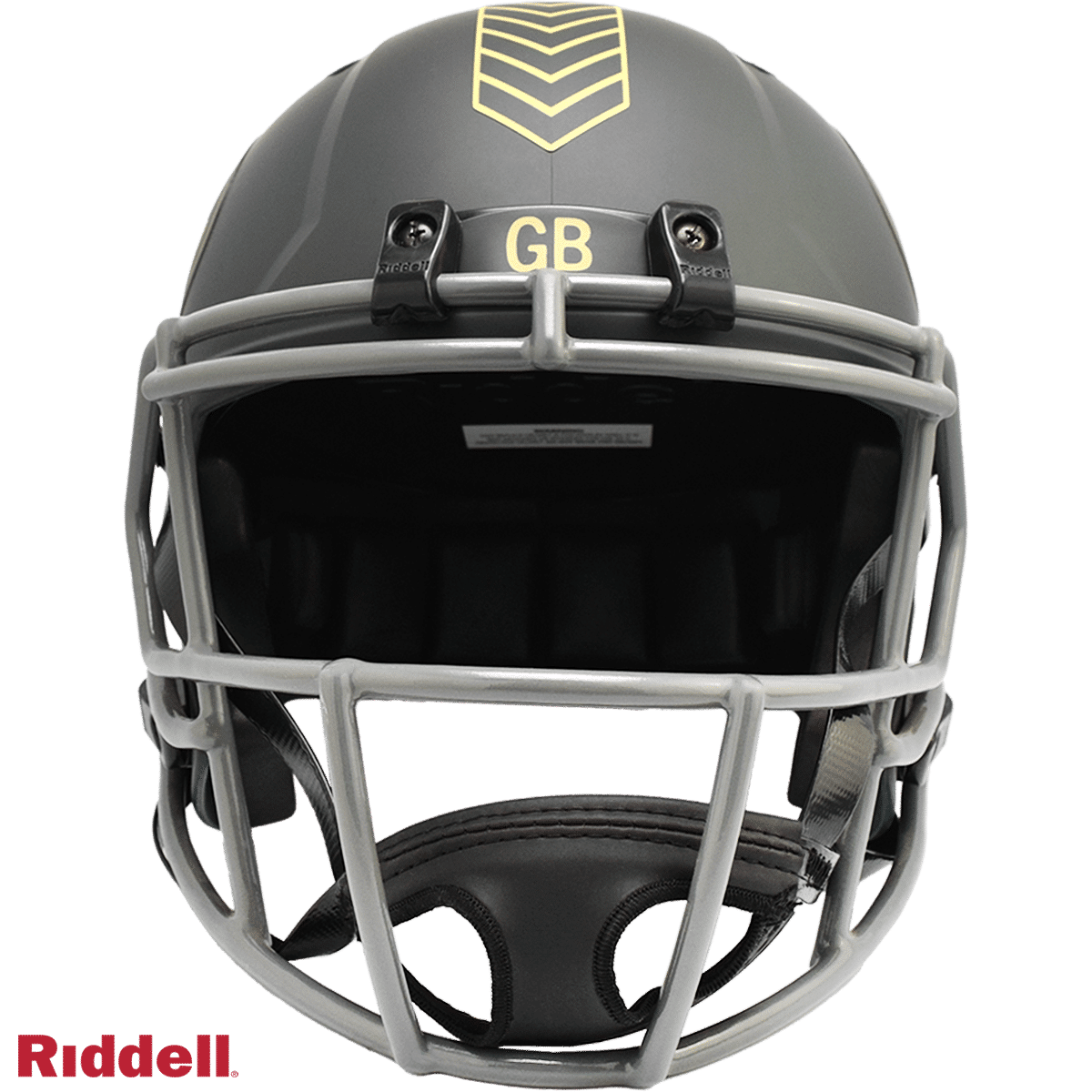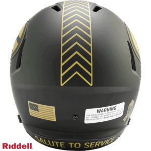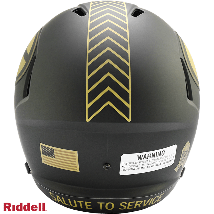 The 2025 NFL Salute to Service helmets are inspired by those used by the military for decades and are meant to honor the memory and selfless sacrifices of service members past and present. Each helmet is painted in a dark green satin finish with black appointments and dark gray face mask. The matte tonal decals match the official 2025 Salute to Service design elements and colorway. A chevron stripe pattern is used on every helmet, along with city name abbreviations on front bumpers, and Salute to Service back bumper decals. The helmet includes the official Salute to Service ribbon and a tonal U.S. flag. Made by Riddell.