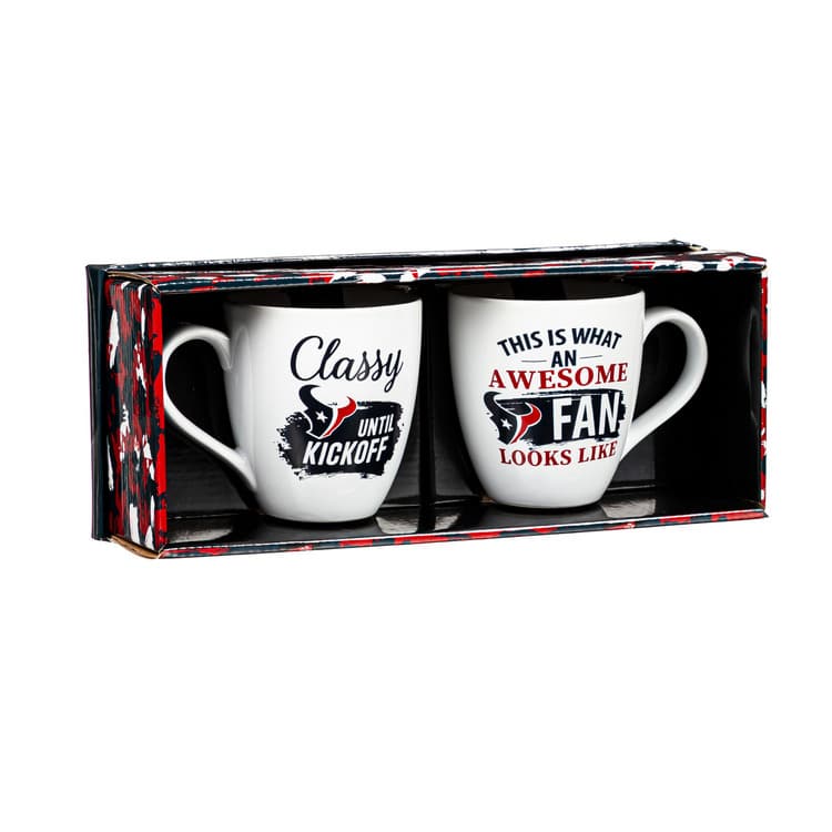 A boxed set of two 17oz ceramic mugs featuring the team logo and colors. Reads: ‘This is what an awesome fan looks like’ and ‘Classy until kickoff’. Comes