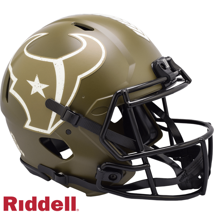 The Salute to Service helmets are inspired by those used by the military for decades, and are meant to honor the memory and selfless sacrifices of service members past and present. Each helmet features a dark satin olive green color shell with black internal parts, decals that are a stressed off-white single color depiction of team logos, a chevron top stripe pattern, a stencil city name on front bumper, stencil “Salute to Service” back bumper, US Flag and official Sature to Service Ribbon. Made by Riddell.