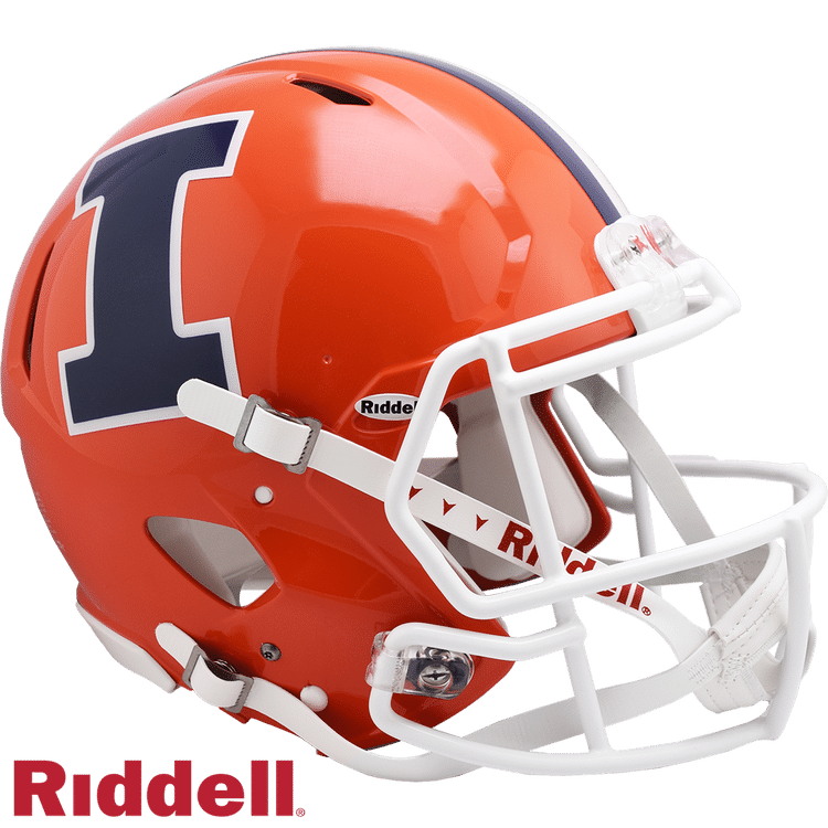 This helmet features an anodized crimson shell with interlocking UI decals. Made by Riddell.