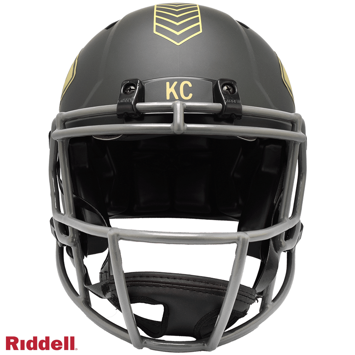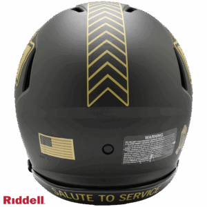 The 2025 NFL Salute to Service helmets are inspired by those used by the military for decades and are meant to honor the memory and selfless sacrifices of service members past and present. Each helmet is painted in a dark green satin finish with black appointments and dark gray face mask. The matte tonal decals match the official 2025 Salute to Service design elements and colorway. A chevron stripe pattern is used on every helmet, along with city name abbreviations on front bumpers, and Salute to Service back bumper decals. The helmet includes the official Salute to Service ribbon and a tonal U.S. flag. Made by Riddell.