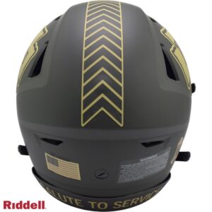 The 2025 NFL Salute to Service helmets are inspired by those used by the military for decades and are meant to honor the memory and selfless sacrifices of service members past and present. Each helmet is painted in a dark green satin finish with black appointments and dark gray face mask. The matte tonal decals match the official 2025 Salute to Service design elements and colorway. A chevron stripe pattern is used on every helmet, along with city name abbreviations on front bumpers, and Salute to Service back bumper decals. The helmet includes the official Salute to Service ribbon and a tonal U.S. flag. Made by Riddell.