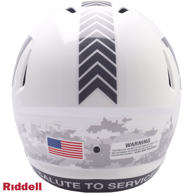 The Salute to Service helmets are inspired by those used by the military for decades, and are meant to honor the memory and selfless sacrifices of service members past and present. Each helmet features team logos, a chevron top stripe pattern, a stencil city name on front bumper, stencil Salute to Service back bumper, US Flag and official Sature to Service Ribbon. Made by Riddell.