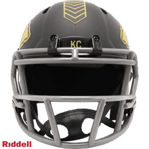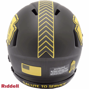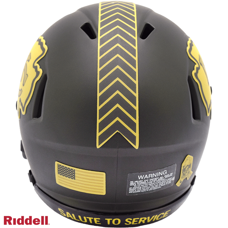 The 2025 NFL Salute to Service helmets are inspired by those used by the military for decades and are meant to honor the memory and selfless sacrifices of service members past and present. Each helmet is painted in a dark green satin finish with black appointments and dark gray face mask. The matte tonal decals match the official 2025 Salute to Service design elements and colorway. A chevron stripe pattern is used on every helmet, along with city name abbreviations on front bumpers, and Salute to Service back bumper decals. The helmet includes the official Salute to Service ribbon and a tonal U.S. flag. Made by Riddell.