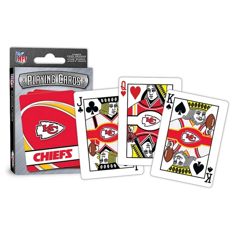 Set includes 52 playing cards and 2 jokers. Card size is 3.5 x 2.5 inch. All face cards and jokers have individuallized team designs. Ace of Spades has special wood cut football design. Made by MasterPieces Puzzles.