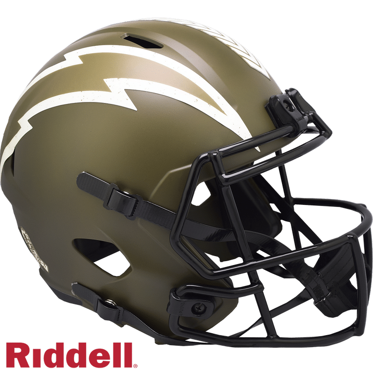 The Salute to Service helmets are inspired by those used by the military for decades, and are meant to honor the memory and selfless sacrifices of service members past and present. Each helmet features a dark satin olive green color shell with black internal parts, decals that are a stressed off-white single color depiction of team logos, a chevron top stripe pattern, a stencil city name on front bumper, stencil “Salute to Service” back bumper, US Flag and official Sature to Service Ribbon. Made by Riddell.