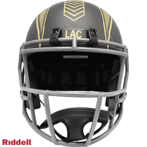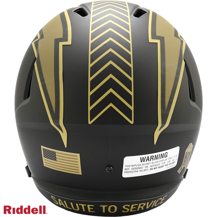 The 2025 NFL Salute to Service helmets are inspired by those used by the military for decades and are meant to honor the memory and selfless sacrifices of service members past and present. Each helmet is painted in a dark green satin finish with black appointments and dark gray face mask. The matte tonal decals match the official 2025 Salute to Service design elements and colorway. A chevron stripe pattern is used on every helmet, along with city name abbreviations on front bumpers, and Salute to Service back bumper decals. The helmet includes the official Salute to Service ribbon and a tonal U.S. flag. Made by Riddell.
