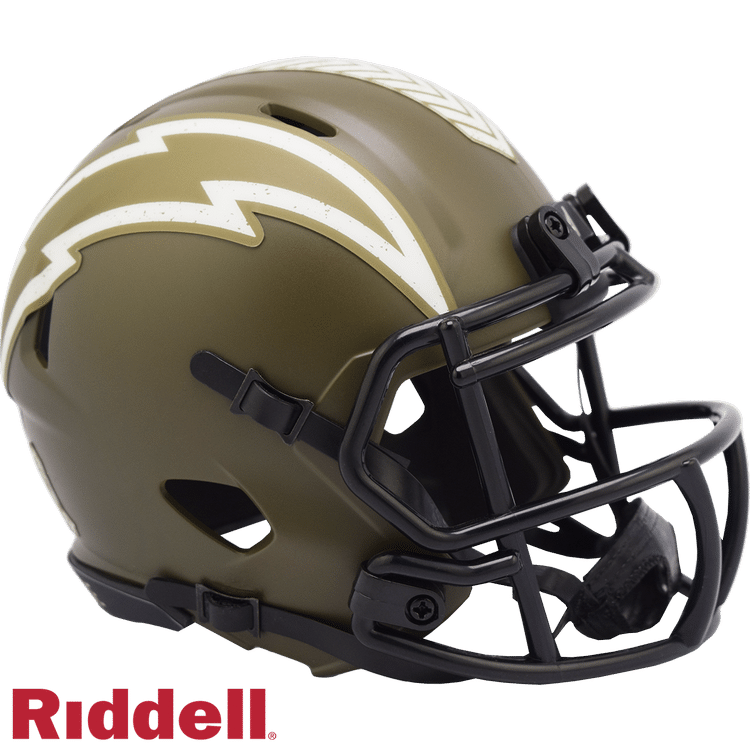 The Salute to Service helmets are inspired by those used by the military for decades, and are meant to honor the memory and selfless sacrifices of service members past and present. Each helmet features a dark satin olive green color shell with black internal parts, decals that are a stressed off-white single color depiction of team logos, a chevron top stripe pattern, a stencil city name on front bumper, stencil “Salute to Service” back bumper, US Flag and official Sature to Service Ribbon. Made by Riddell.