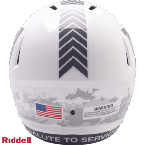 The Salute to Service helmets are inspired by those used by the military for decades, and are meant to honor the memory and selfless sacrifices of service members past and present. Each helmet features team logos, a chevron top stripe pattern, a stencil city name on front bumper, stencil Salute to Service back bumper, US Flag and official Sature to Service Ribbon. Made by Riddell.