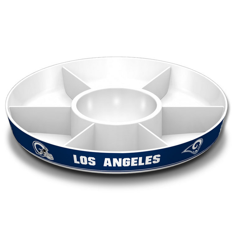 Snack in spirited style with this versatile Party Platter! Bright and bold 14 1/2″ dia. melamine platter features your favorite football team graphics and colors and can be used alone or with custom dividers. Includes 6 removable dividers and a dipping bowl, so you can choose from 7 different serving configurations by simply sliding the slotted pieces together. Specify team. Hand wash with mild soap.
