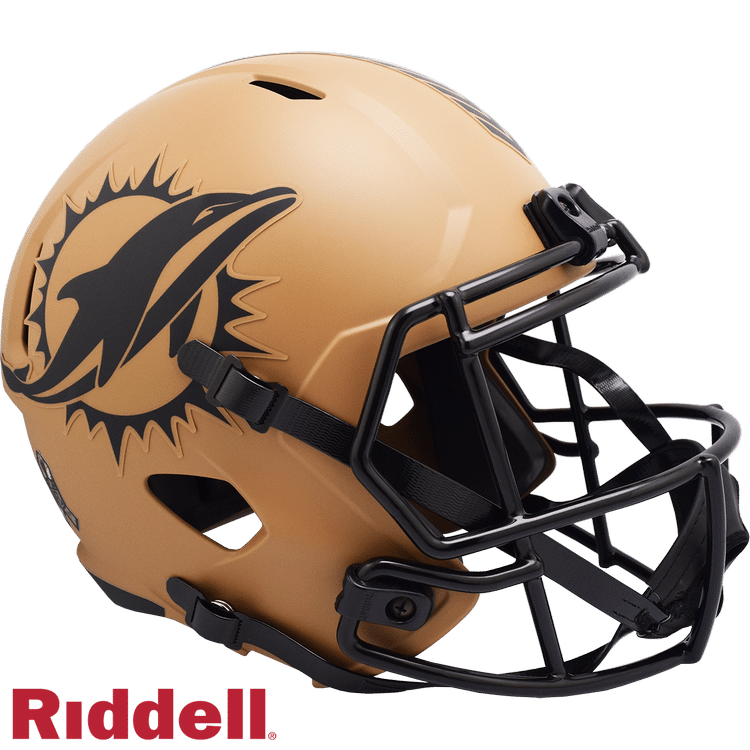 The Salute to Service helmets are inspired by those used by the military for decades, and are meant to honor the memory and selfless sacrifices of service members past and present. Each helmet features decals that are a stressed team logos, a chevron top stripe pattern, a stencil city name on front bumper, stencil Salute to Service back bumper, US Flag and official Salute to Service Ribbon. Made by Riddell.