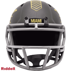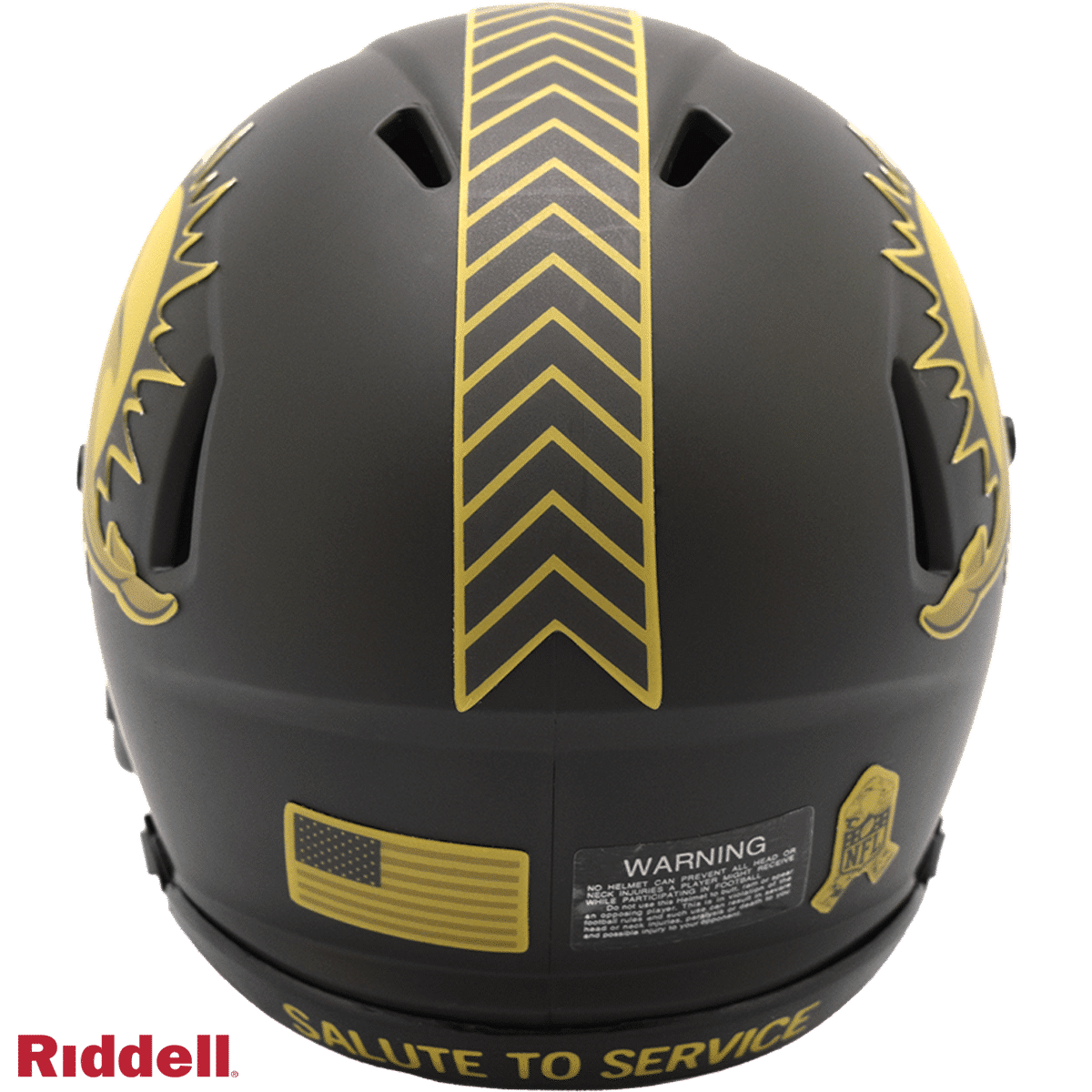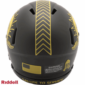 The 2025 NFL Salute to Service helmets are inspired by those used by the military for decades and are meant to honor the memory and selfless sacrifices of service members past and present. Each helmet is painted in a dark green satin finish with black appointments and dark gray face mask. The matte tonal decals match the official 2025 Salute to Service design elements and colorway. A chevron stripe pattern is used on every helmet, along with city name abbreviations on front bumpers, and Salute to Service back bumper decals. The helmet includes the official Salute to Service ribbon and a tonal U.S. flag. Made by Riddell.