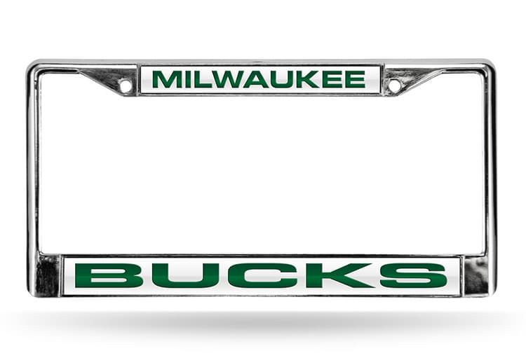 Milwaukee Bucks License Plate Frame Laser Cut Chrome White Background with Green Letters