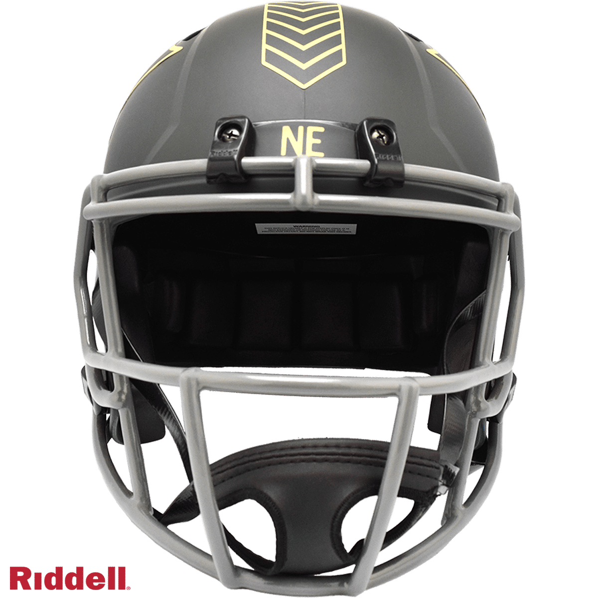 The 2025 NFL Salute to Service helmets are inspired by those used by the military for decades and are meant to honor the memory and selfless sacrifices of service members past and present. Each helmet is painted in a dark green satin finish with black appointments and dark gray face mask. The matte tonal decals match the official 2025 Salute to Service design elements and colorway. A chevron stripe pattern is used on every helmet, along with city name abbreviations on front bumpers, and Salute to Service back bumper decals. The helmet includes the official Salute to Service ribbon and a tonal U.S. flag. Made by Riddell.