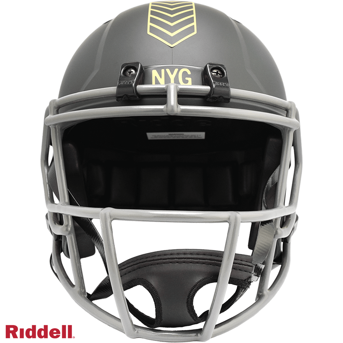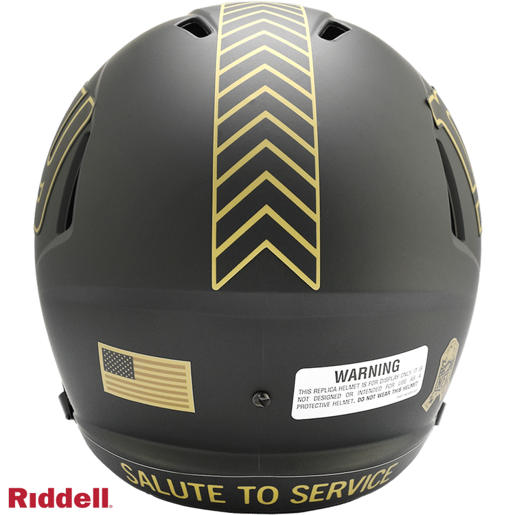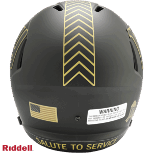 The 2025 NFL Salute to Service helmets are inspired by those used by the military for decades and are meant to honor the memory and selfless sacrifices of service members past and present. Each helmet is painted in a dark green satin finish with black appointments and dark gray face mask. The matte tonal decals match the official 2025 Salute to Service design elements and colorway. A chevron stripe pattern is used on every helmet, along with city name abbreviations on front bumpers, and Salute to Service back bumper decals. The helmet includes the official Salute to Service ribbon and a tonal U.S. flag. Made by Riddell.