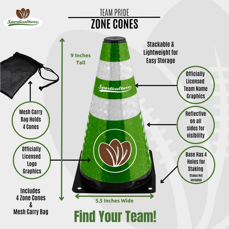 Set boundaries on the field or at your next tailgate. These multipurpose, lightweight and stackable cones come wrapped with reflective team color designs and officially licensed logos, making each cone easily visible. Designed for use on any surface. They are perfect for all outdoor activities, tailgates, dog or cycle training drills and party decor. Each cone measures approximately 5.5 inches wide and 9 inches tall. Set includes 4 cones and 1 mesh carry bag. Made by Sporticulture.