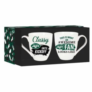 A boxed set of two 17oz ceramic mugs featuring the team logo and colors. Reads: ‘This is what an awesome fan looks like’ and ‘Classy until kickoff’. Comes with matching gift box. Made by Evergreen.