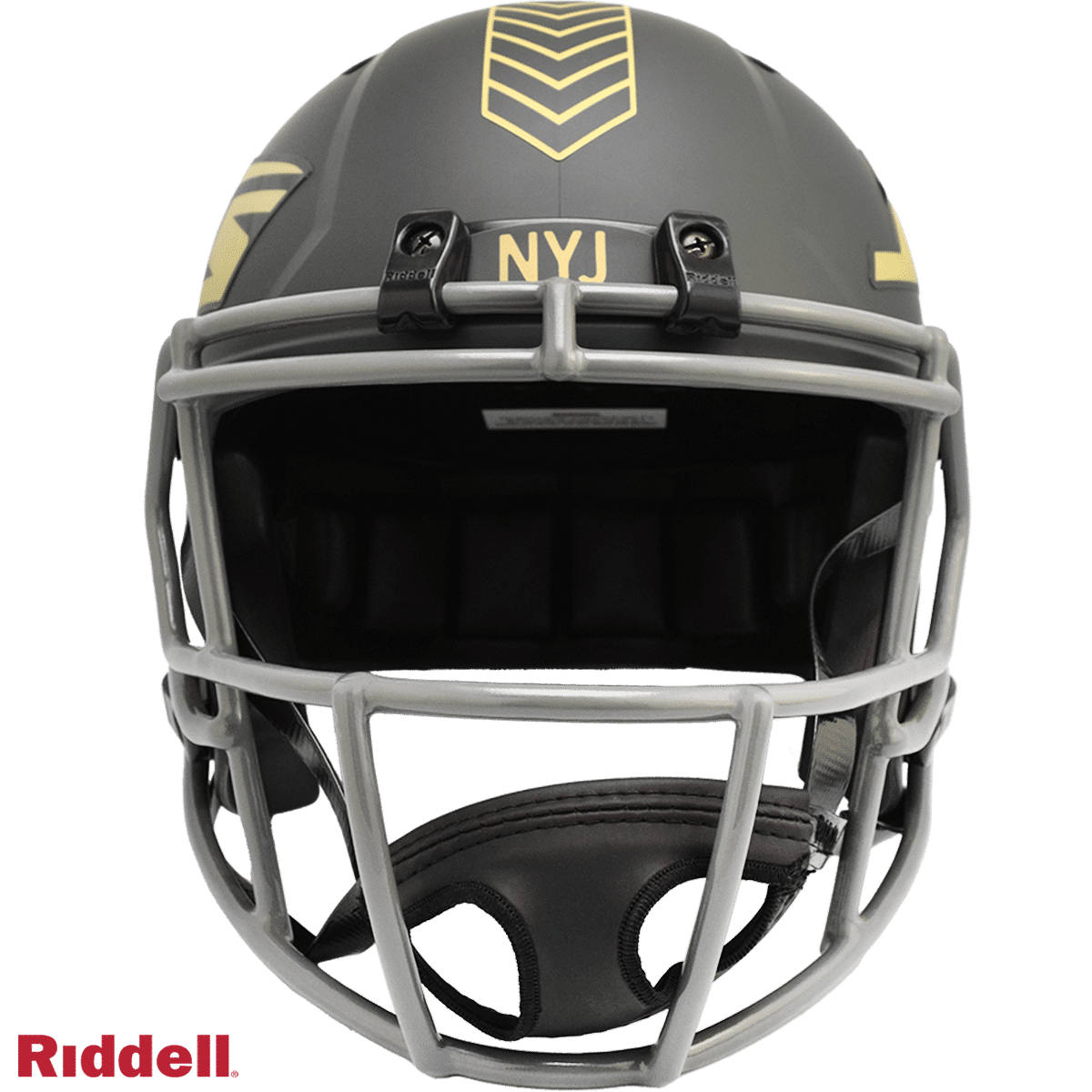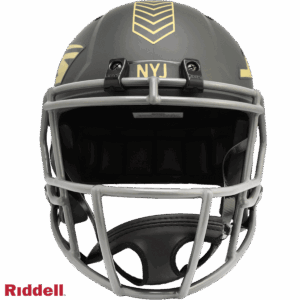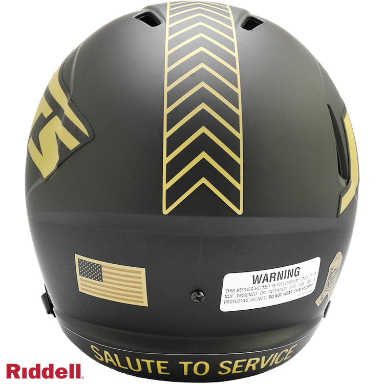 The 2025 NFL Salute to Service helmets are inspired by those used by the military for decades and are meant to honor the memory and selfless sacrifices of service members past and present. Each helmet is painted in a dark green satin finish with black appointments and dark gray face mask. The matte tonal decals match the official 2025 Salute to Service design elements and colorway. A chevron stripe pattern is used on every helmet, along with city name abbreviations on front bumpers, and Salute to Service back bumper decals. The helmet includes the official Salute to Service ribbon and a tonal U.S. flag. Made by Riddell.
