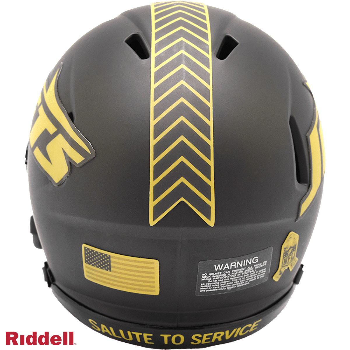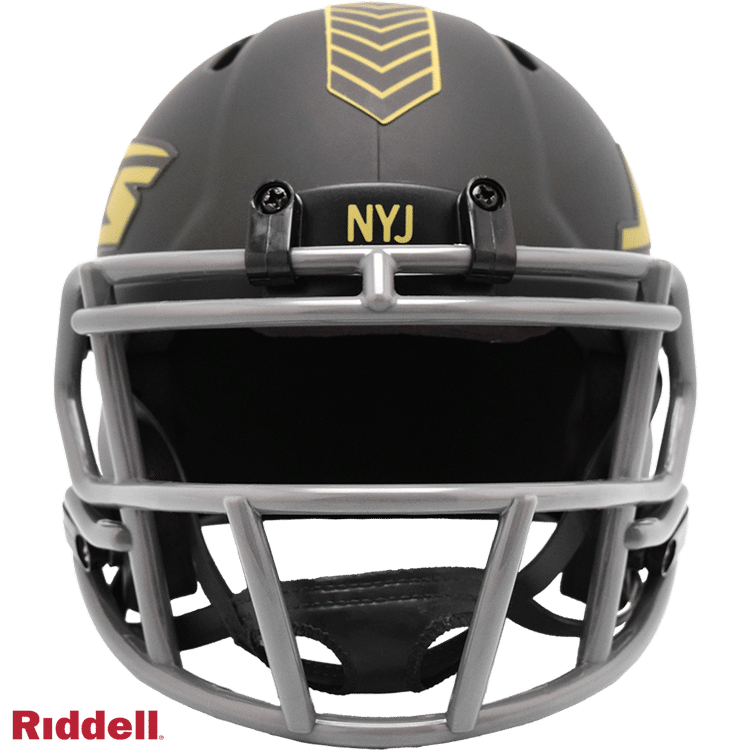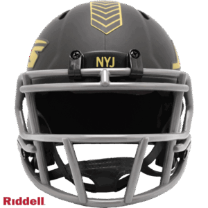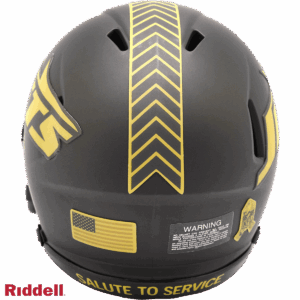 The 2025 NFL Salute to Service helmets are inspired by those used by the military for decades and are meant to honor the memory and selfless sacrifices of service members past and present. Each helmet is painted in a dark green satin finish with black appointments and dark gray face mask. The matte tonal decals match the official 2025 Salute to Service design elements and colorway. A chevron stripe pattern is used on every helmet, along with city name abbreviations on front bumpers, and Salute to Service back bumper decals. The helmet includes the official Salute to Service ribbon and a tonal U.S. flag. Made by Riddell.