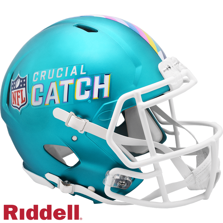 Anodized teal shell, with facemask, NFL Crucial Catch logo on both sides, and Crucial Catch patterned top stripe decal. The NFL does not profit from the sale of Crucial Catch products. Charitable contributions are awarded by the NFL Foundation to teh American Cancer Society. For more information, please visit NFL.com/CuricalCatch. Made by Riddell.