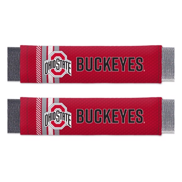 Add comfort in style with this 2 piece rally seatbelt pad set. These seatbelt pads are sold in pairs and each feature a full color print with team name and logo. They are made from soft polyester and a durable velcro closure. The plush padding gives added comfort to seatbelts, luggage, messenger bags or any shoulder strap. Made by Fan Mats.
