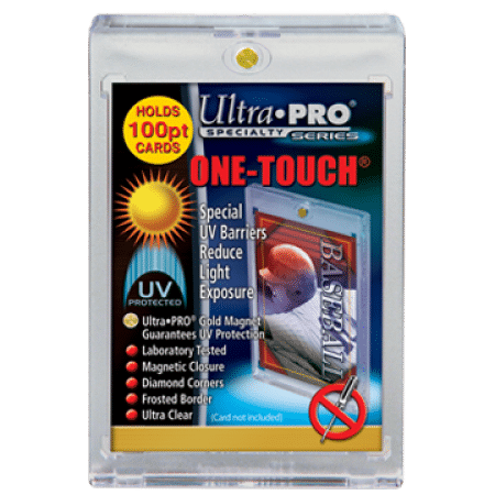 Designed as the final destination for your collectible cards, our two-piece One Touch holders are uniquely designed with slide-in hinge and magnetic closure so you’ll never have to use a screwdriver again. The holder provides UV-resistant, no-PVC and acid free protection to ensure your valuable hit retains its condition while under display. This model can hold standard cards (2-1/2″ X 3-1/2″) up to 100pt in thickness. Made by Ultra Pro