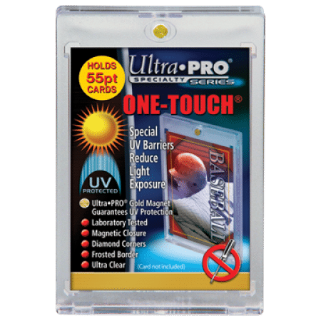 Designed as the final destination for your collectible cards, our two-piece One Touch holders are uniquely designed with slide-in hinge and magnetic closure so you’ll never have to use a screwdriver again. The holder provides UV-resistant, no-PVC and acid free protection to ensure your valuable hit retains its condition while under display. This model can hold standard cards (2-1/2″ X 3-1/2″) up to 55pt in thickness. Made by Ultra Pro