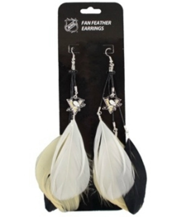 Support your favorite team while wearing these stylish hook earrings! The feather earrings features your team color and a pewter dangle logo. Each earring has