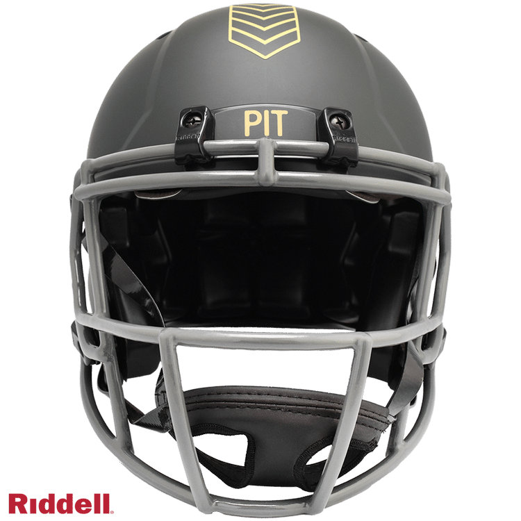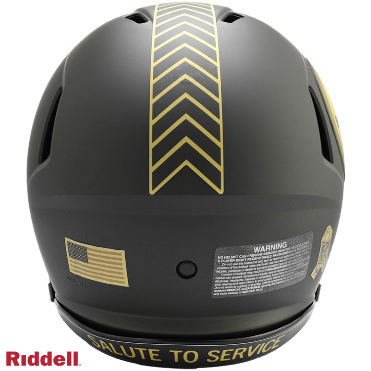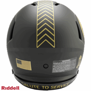 The 2025 NFL Salute to Service helmets are inspired by those used by the military for decades and are meant to honor the memory and selfless sacrifices of service members past and present. Each helmet is painted in a dark green satin finish with black appointments and dark gray face mask. The matte tonal decals match the official 2025 Salute to Service design elements and colorway. A chevron stripe pattern is used on every helmet, along with city name abbreviations on front bumpers, and Salute to Service back bumper decals. The helmet includes the official Salute to Service ribbon and a tonal U.S. flag. Made by Riddell.