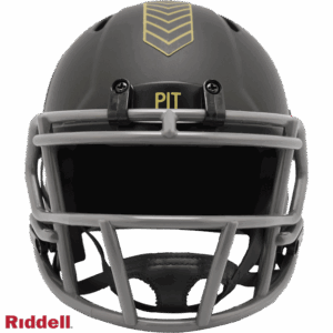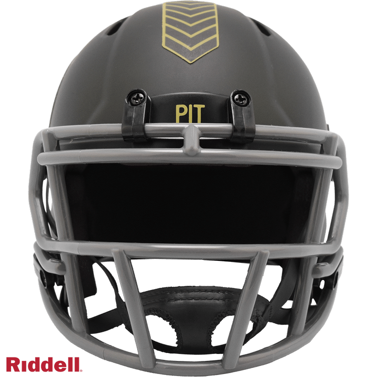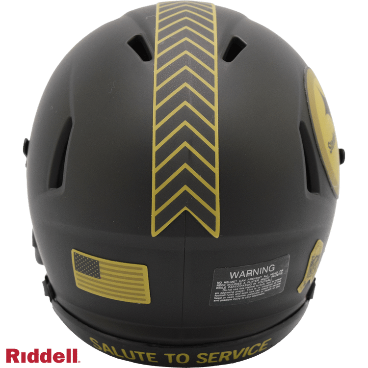 The 2025 NFL Salute to Service helmets are inspired by those used by the military for decades and are meant to honor the memory and selfless sacrifices of service members past and present. Each helmet is painted in a dark green satin finish with black appointments and dark gray face mask. The matte tonal decals match the official 2025 Salute to Service design elements and colorway. A chevron stripe pattern is used on every helmet, along with city name abbreviations on front bumpers, and Salute to Service back bumper decals. The helmet includes the official Salute to Service ribbon and a tonal U.S. flag. Made by Riddell.